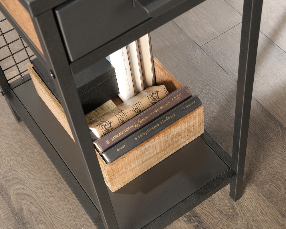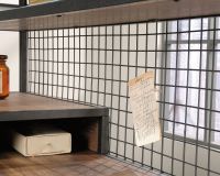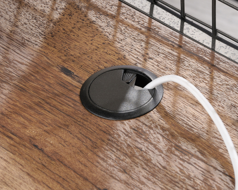 - Elevated shelving with practical and stylish mesh above the desk for additional storage options