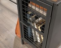 - Two storage drawers with extension slides and an adjustable shelf behind a metal door with wire mesh front