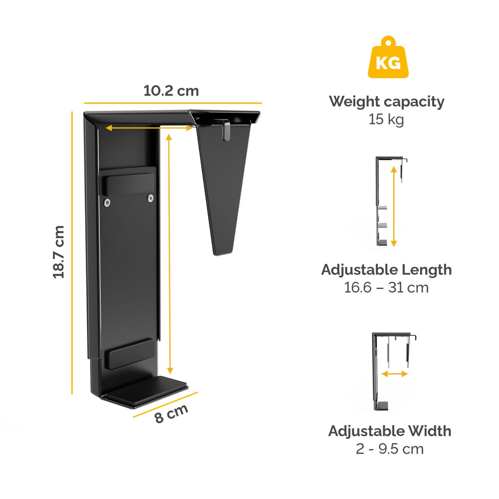 - MAXIMUM WEIGHT - Adjustable width (2 - 9.5cm) and length (16.6 - 31cm) to accommodate most thin client and small CPU's up to 15kg
