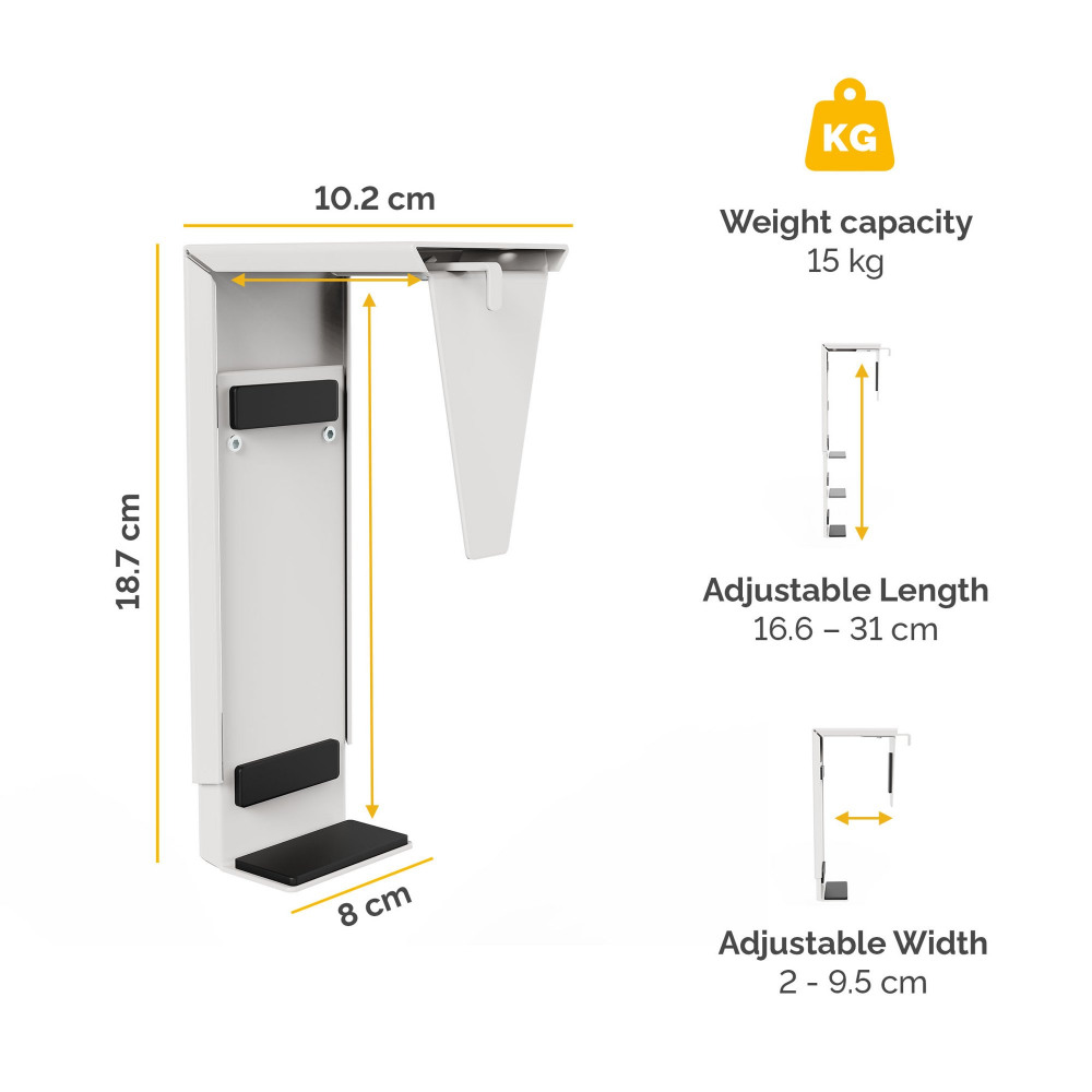 - MAXIMUM WEIGHT - Adjustable width (2 - 9.5cm) and length (16.6 - 31cm) to accommodate most thin client and small CPU's up to 15kg