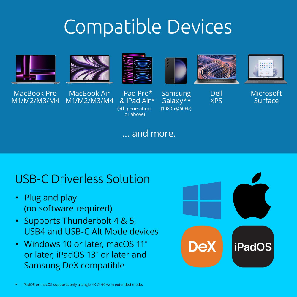 - Supports Thunderbolt⢠4 & 5, USB4® and USB-C® Alt Mode devices.