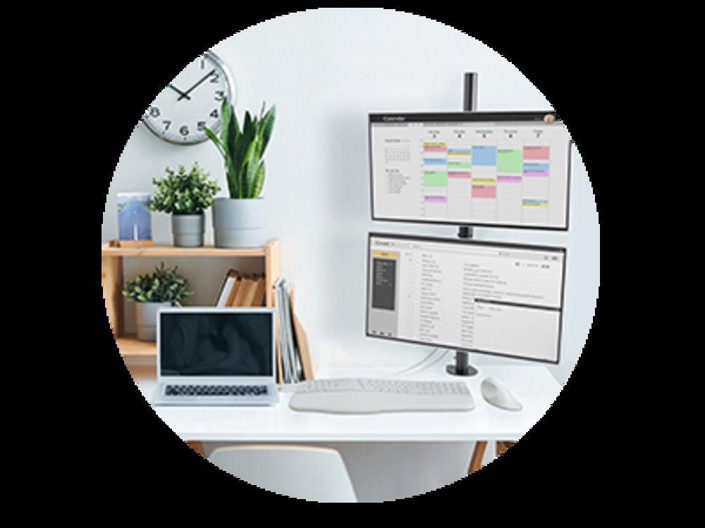 - Stacked monitor arrangement maximises desk space by allowing two monitors in a single footprint