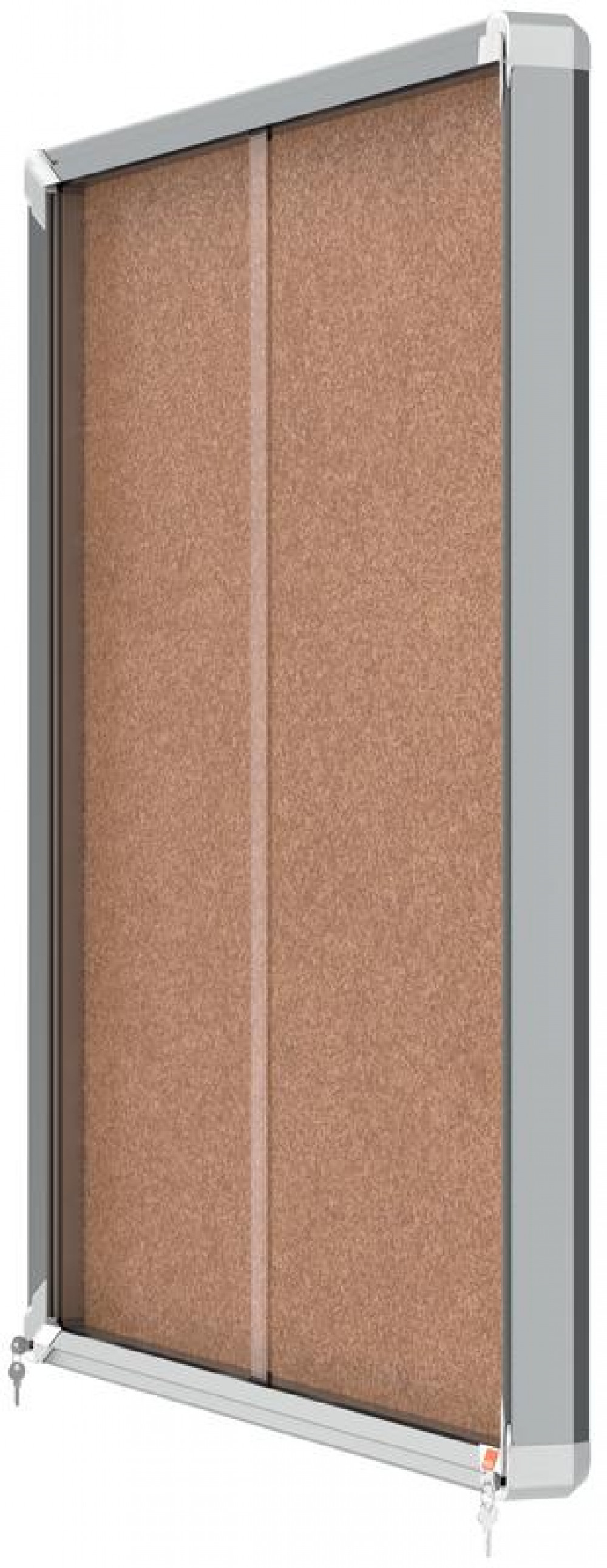 - Lockable notice board with sliding safety glass doors and unobtrusive integrated corner lock