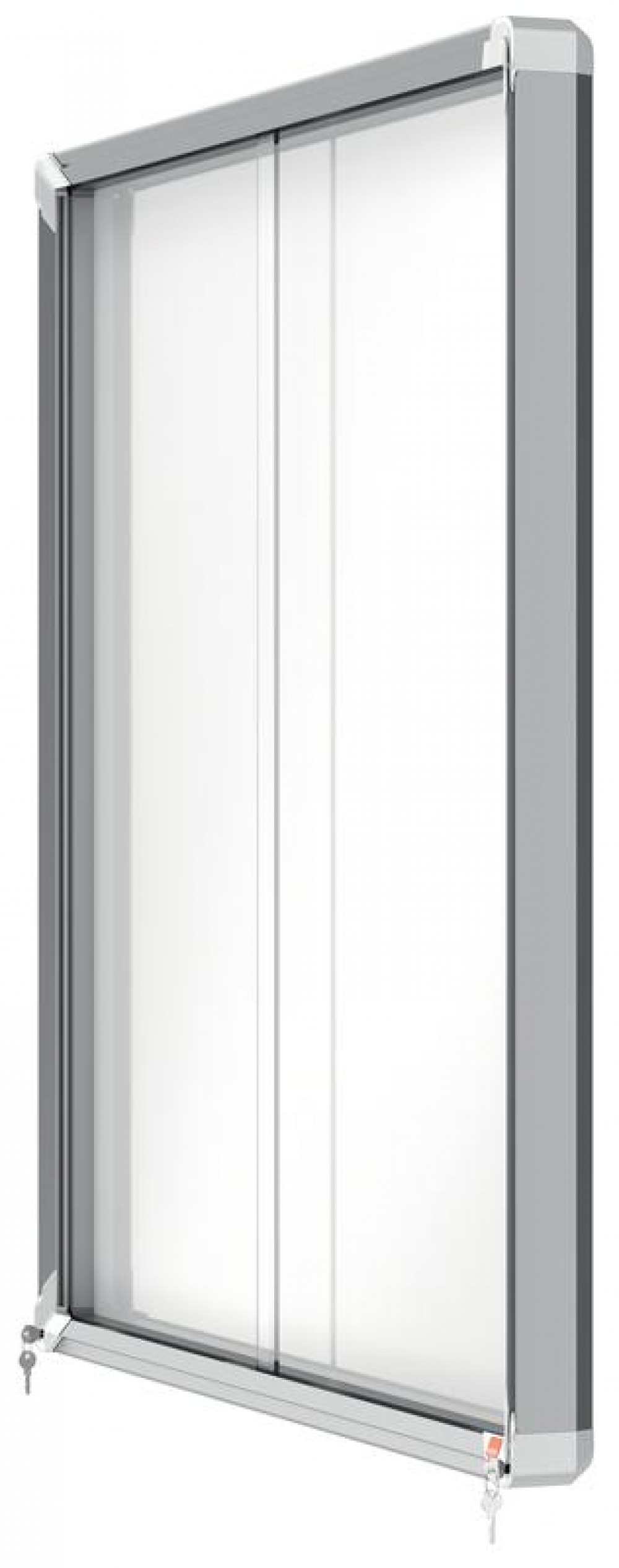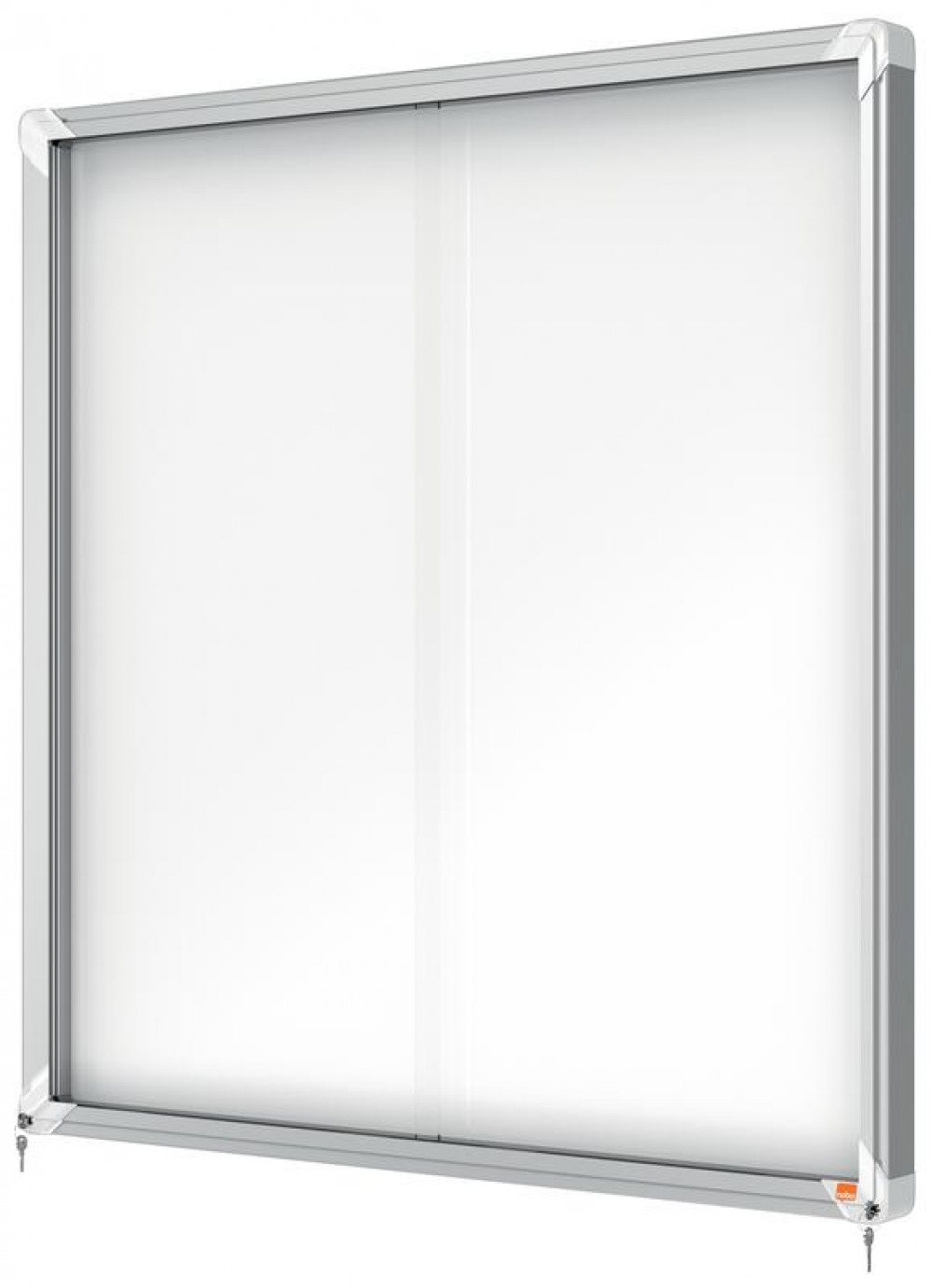 - Lockable notice board with sliding safety glass doors and unobtrusive integrated corner lock