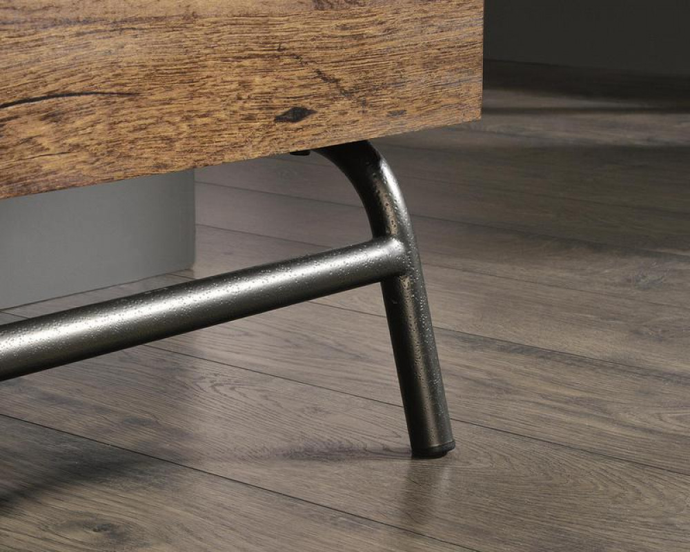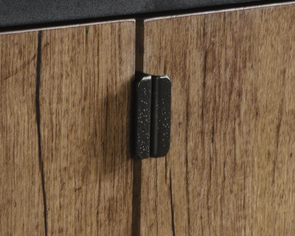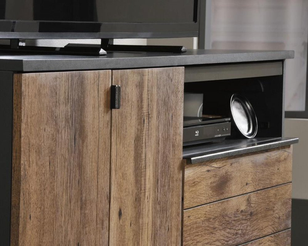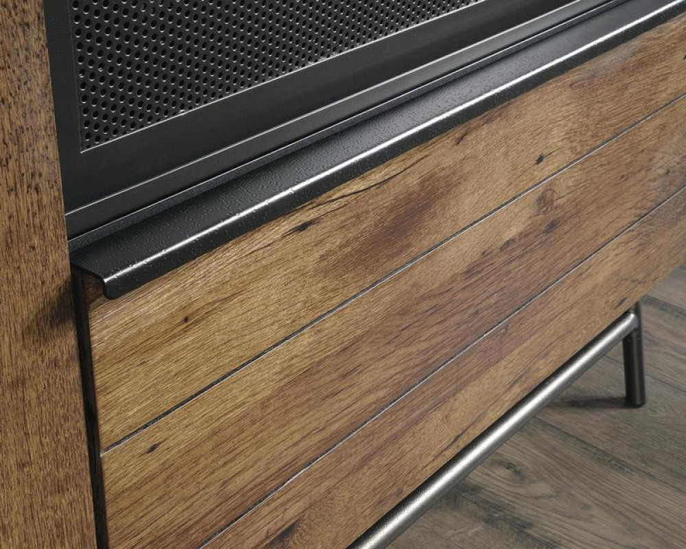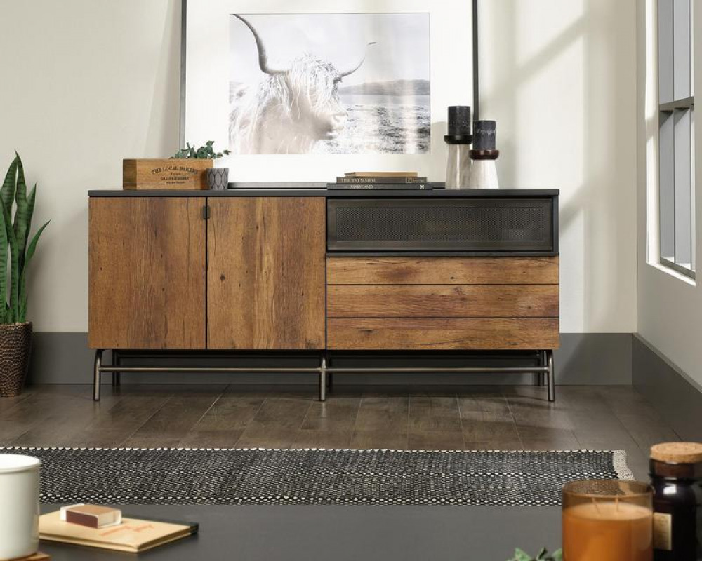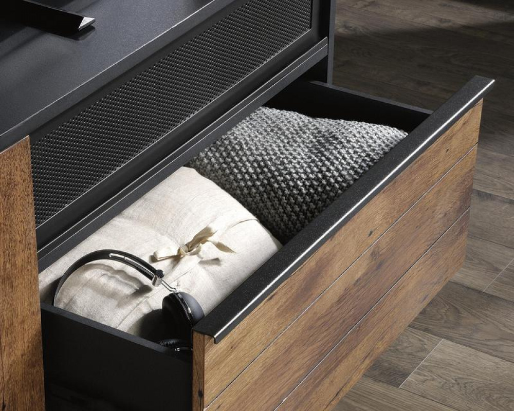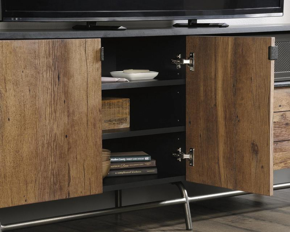 Teknik Office Boulevard Cafe TV Credenza in a black finish with Vintage Oak accents accommodates up to 60ââ¬Â TV 2 adjustable shelves behind doors