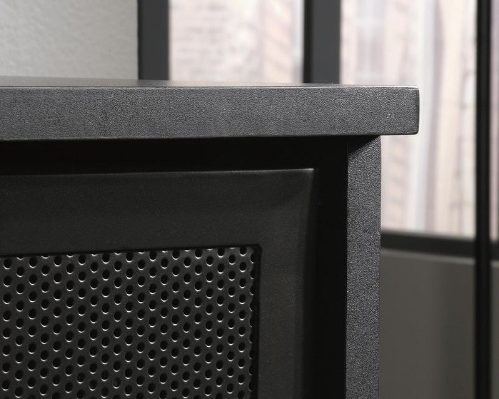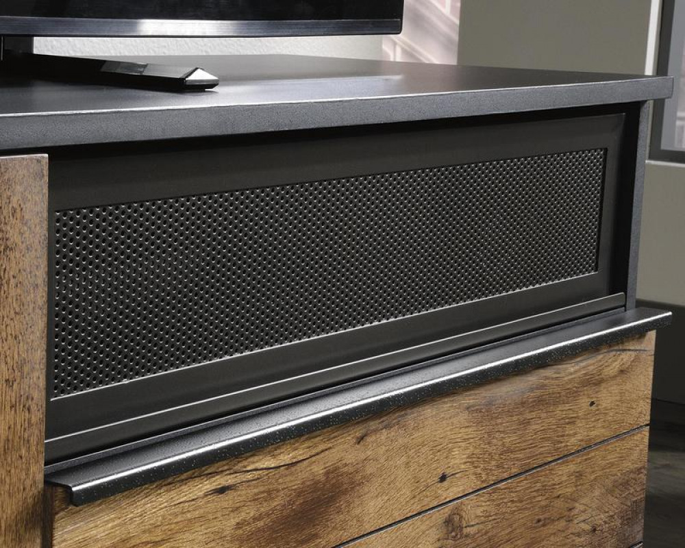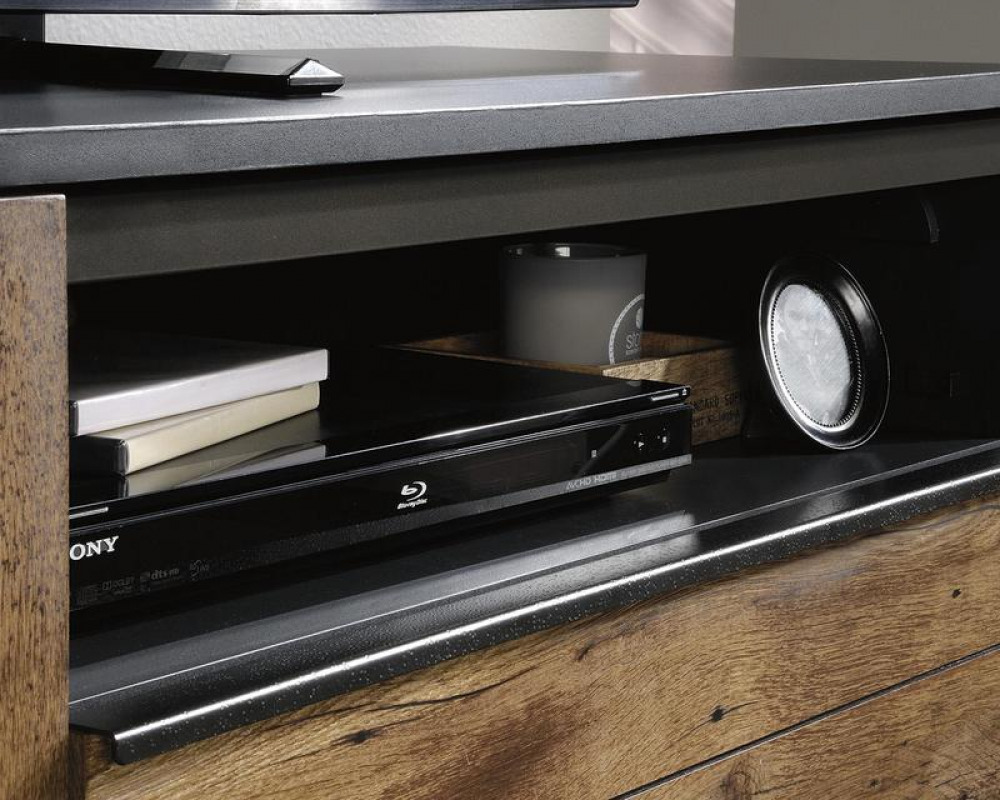 - Perforated metal door flips up and slides back into the TV stand offering further storage space for audio/video equipment