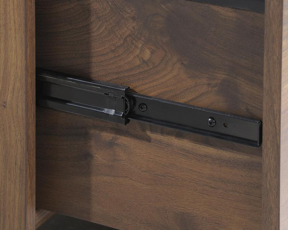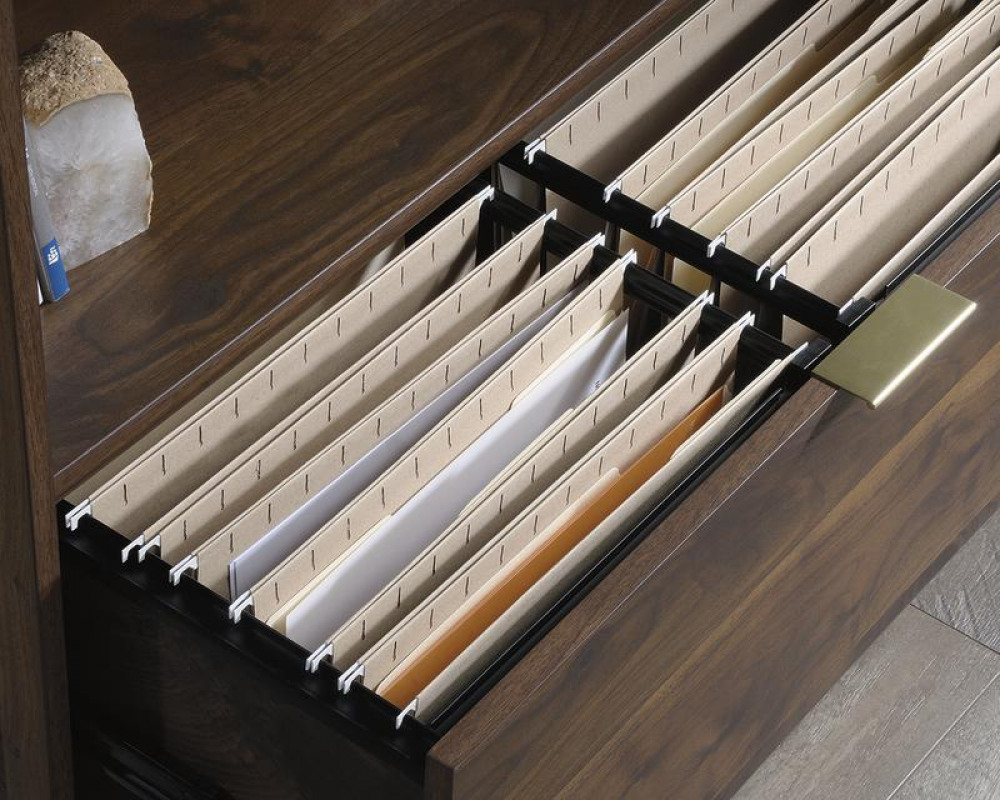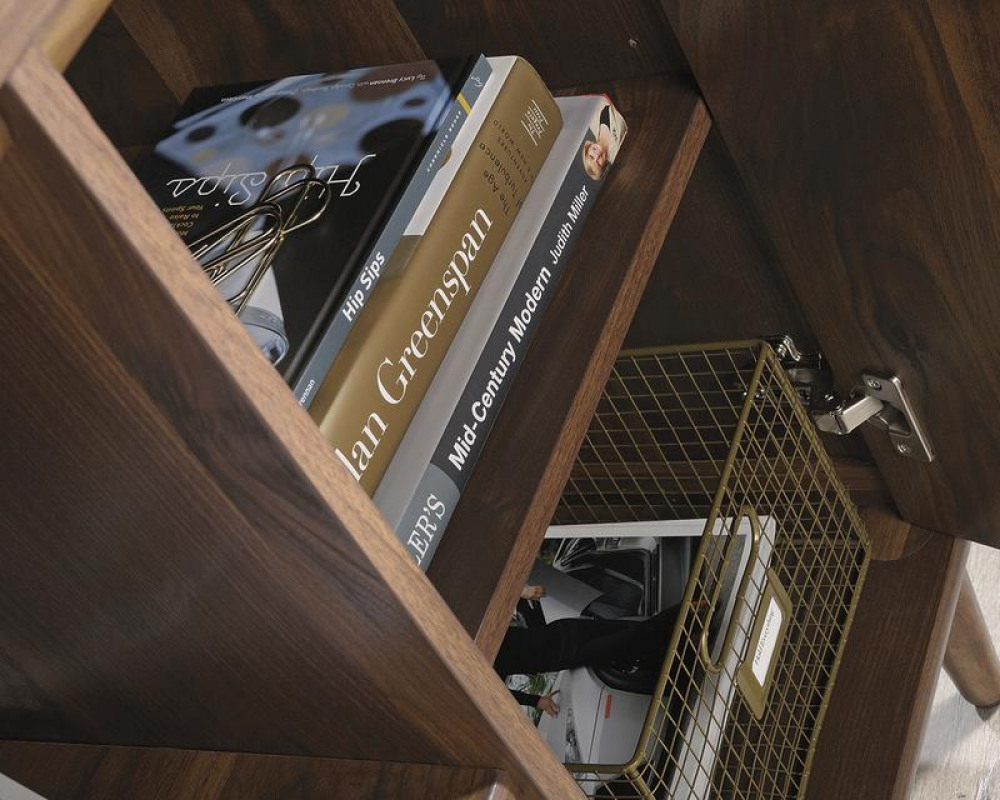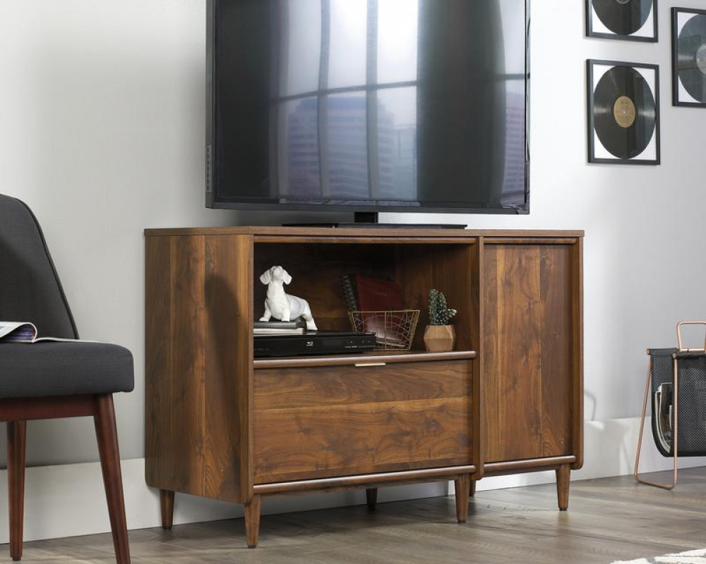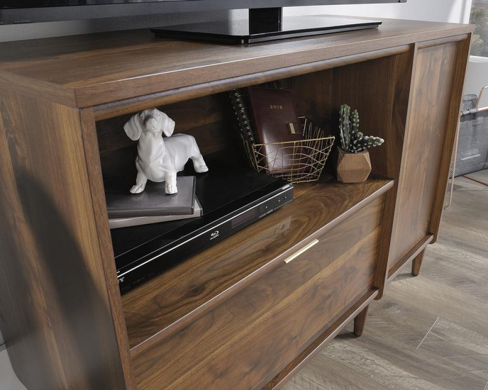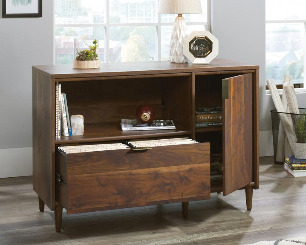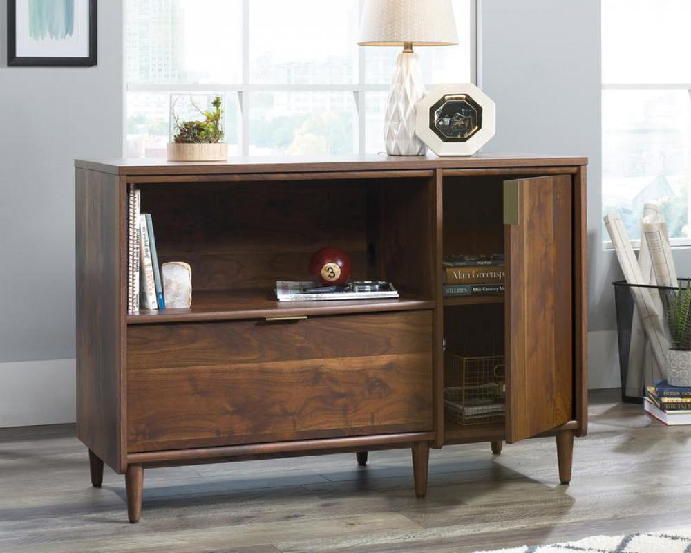 Teknik Office Clifton Place Credenza Grand Walnut Effect Finish Open Display Shelf Hidden Adjustable Shelf Large File Drawer and Solid Wooden Feet