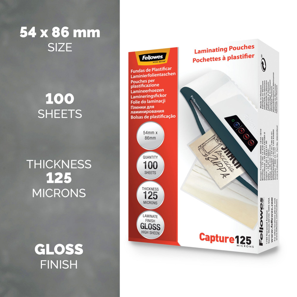 Fellowes 54x86mm Capture Gloss Laminating Pouches 250 Micron (Pack of 100) 53063