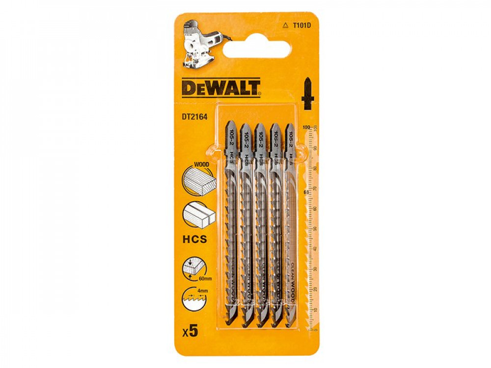 - The DEWALT DT2164 (T101D) HCS Wood Jigsaw Blades are ideal for clean, straight cuts in wood, chipboard, plywood, laminated chipboard & plastic up to 60mm thick.