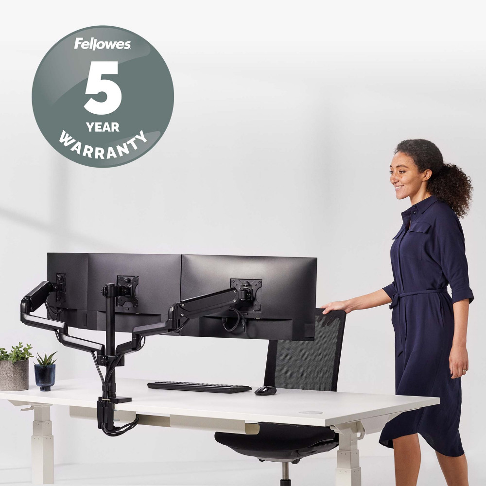 - BUILT-IN USB PORTS - Built in dual USB connectivity and intuitive cable management allows you to stay connected and minimise clutter at the same time with the Fellowes Platinum Series triple monitor arm
