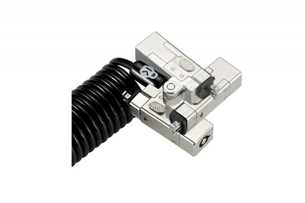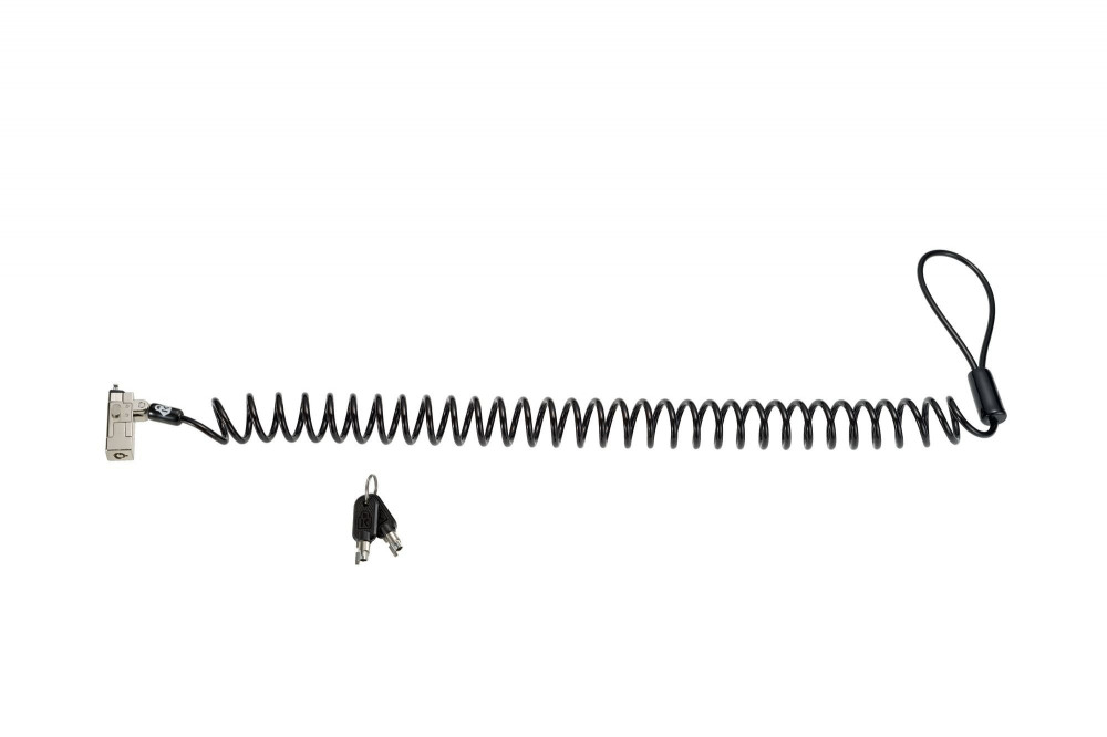 - Self-coiling cut resistant carbon steel cable is easily transportable, stretching up to 1.8m (6´) and shrinking down to 76mm (3â). Protective sheathing helps keep attachment points such as desks and tables free from scratches