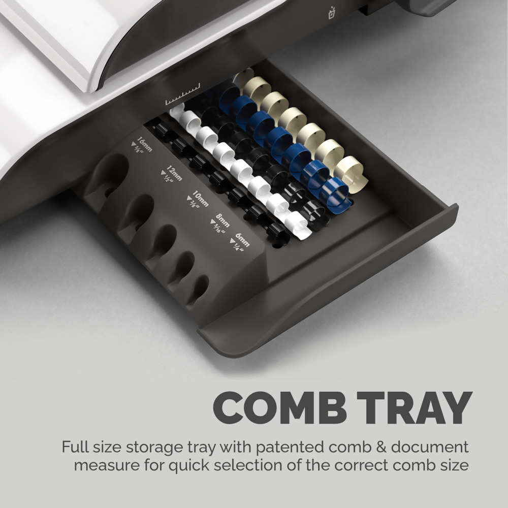 - Storage tray with patented comb & document measure for quick selection of the correct size supplies