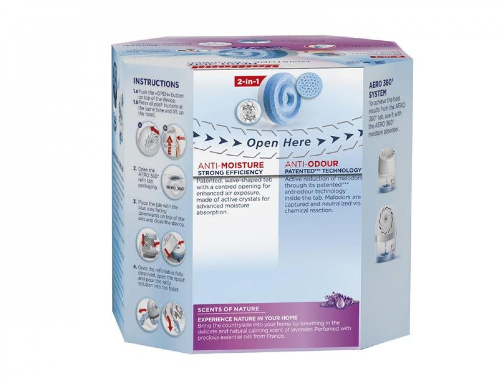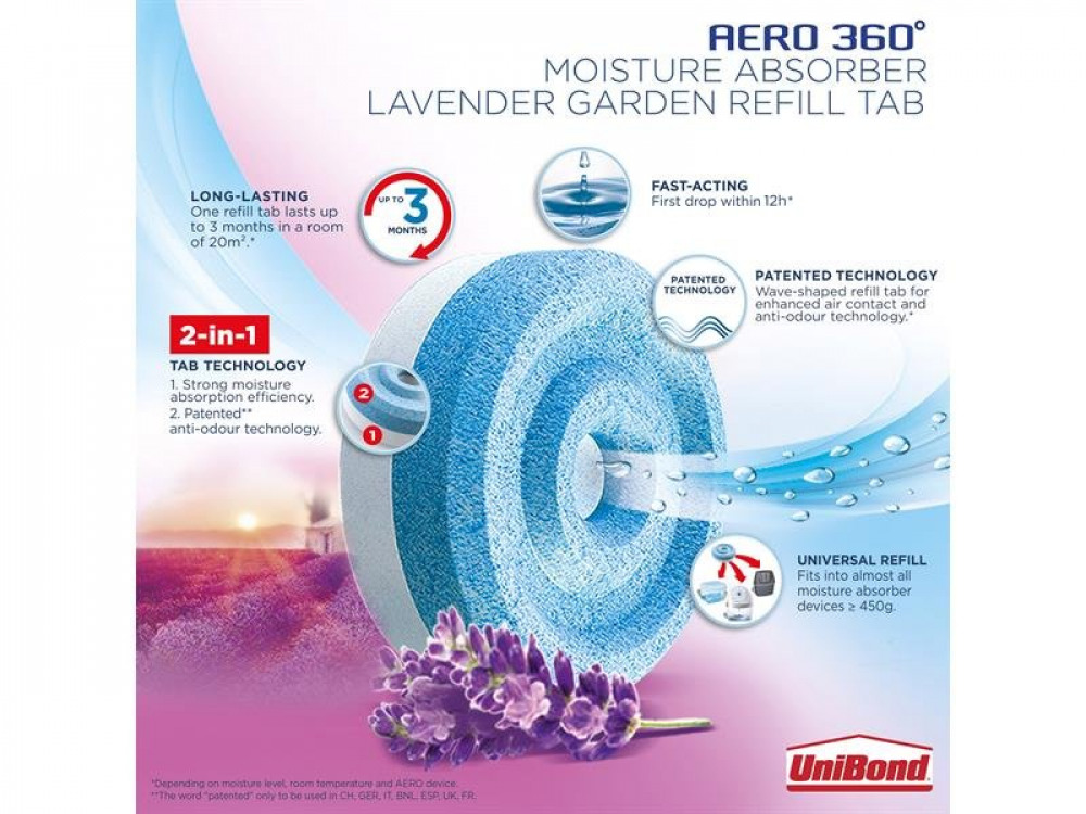 - Unibond Aero 360 Moisture Absorber Lavender Garden Refill Tab with a 2-in-1 technology: anti moisture & anti odour. The integrated Lavender scent with essential oils provides a fresh, clean scent of Lavender in the air.